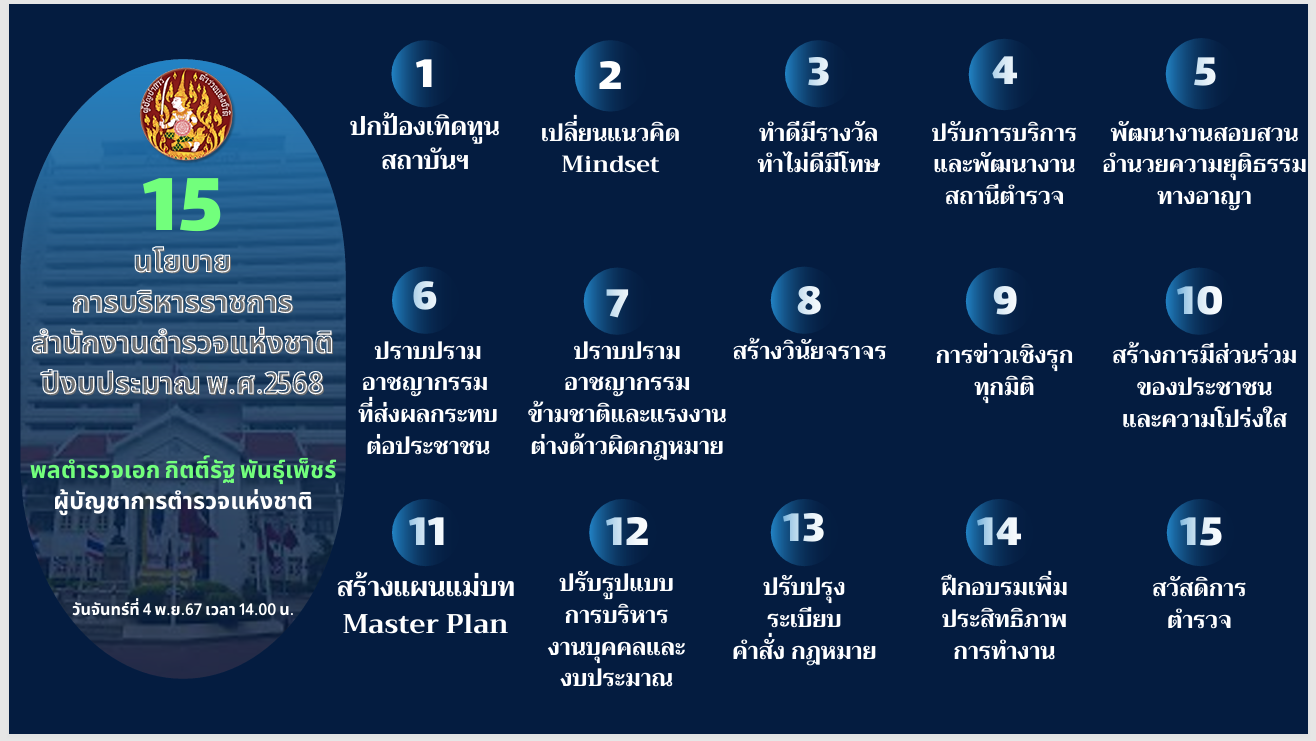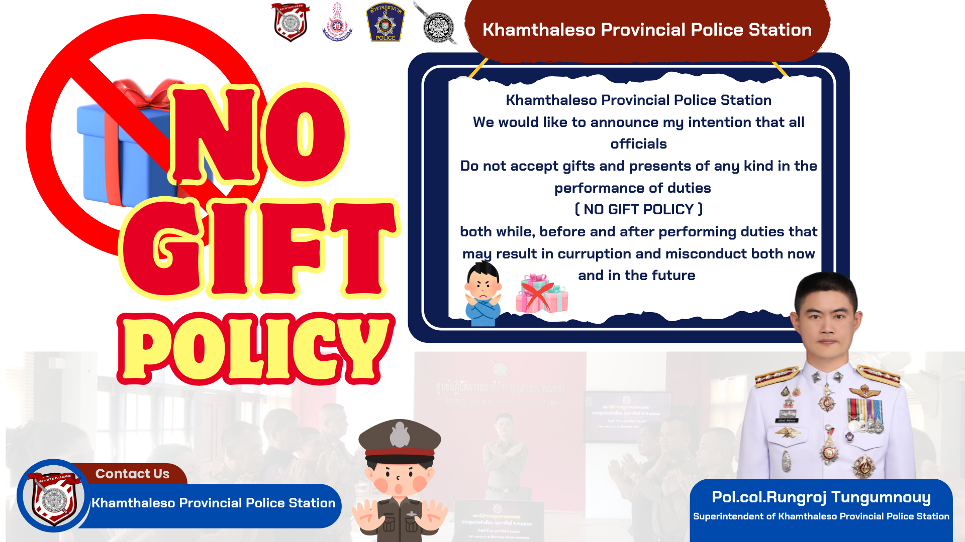 - ประกาศสำนักงานยุทธศาสตร์ตำรวจเรื่องเจตนารมณ์ที่จะไม่รับของขวัญหรือของกำนัลทุกชนิดจากการปฏิบัติหน้าที่