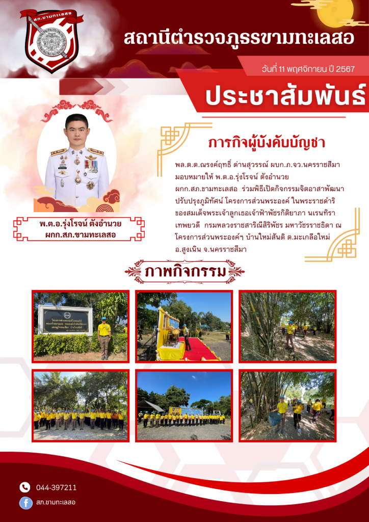 พล.ต.ต.ณรงค์ฤทธิ์ ด่านสุวรรณ์ ผบก.ภ.จว.นครราชสีมา มอบหมายให้ พ.ต.อ.รุ่งโรจน์ ตังอำนวย ผกก.สภ.ขามทะเลสอ ร่วมพิธีเปิดกิจกรรมจิตอาสาพัฒนาปรับปรุงภูมิทัศน์ โครงการส่วนพระองค์ ในพระราชดำริ ของสมเด็จพระเจ้าลูกเธอเจ้าฟ้าพัชรกิติยาภา นเรนทิราเทพยวดี กรมหลวงราชสาริณีสิริพัชร มหาวัชรราชธิดา ณ โครงการส่วนพระองค์ฯ บ้านใหม่สันติ ต.มะเกลือใหม่ อ.สูงเนิน จ.นครราชสีมา 12 พฤศจิกายน 2567 โดย admkhamthaleso / ข่าวประชาสัมพันธ์,ข่าวภารกิจผู้บังคับบัญชา Facebook iconFacebookTwitter iconTwitterLINE iconLine