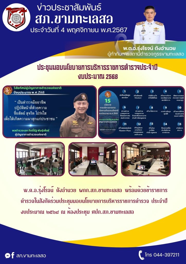 พ.ต.อ.รุ่งโรจน์ ตังอำนวย ผกก.สภ.ขามทะเลสอ พร้อมด้วยข้าราชการตำรวจในสังกัดร่วมประชุมมอบนโยบายการบริหารราชการตำรวจ ประจำปี งบประมาณ ๒๕๖๘ ณ ห้องประชุม ศปก.สภ.ขามทะเลสอ