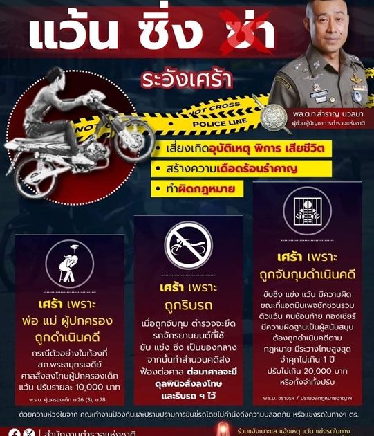 พล.ต.ท.สำราญ ฯ เผย สำนักงานตำรวจแห่งชาติปราบปรามเด็ดขาด เด็กแว้น รถซิ่ง ป่วนเมือง สร้างความเดือดร้อน สกัดเข้ม 3 ทาง สายออกทริปยกล้อต้องระวัง! พร้อมงัด 4 มาตรการ “ขับ – ซ้อน – เชียร์ – ชักชวน – ผู้ปกครอง” โดนแน่ รับโทษหนัก คุก ปรับ ริบรถ.