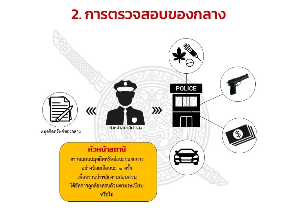 การจัดเก็บของกลาง จัดทำสมุดบัญชียึดและรักษาทรัพย์ของกลาง จัดสถานที่เก็บและตรวจยึด