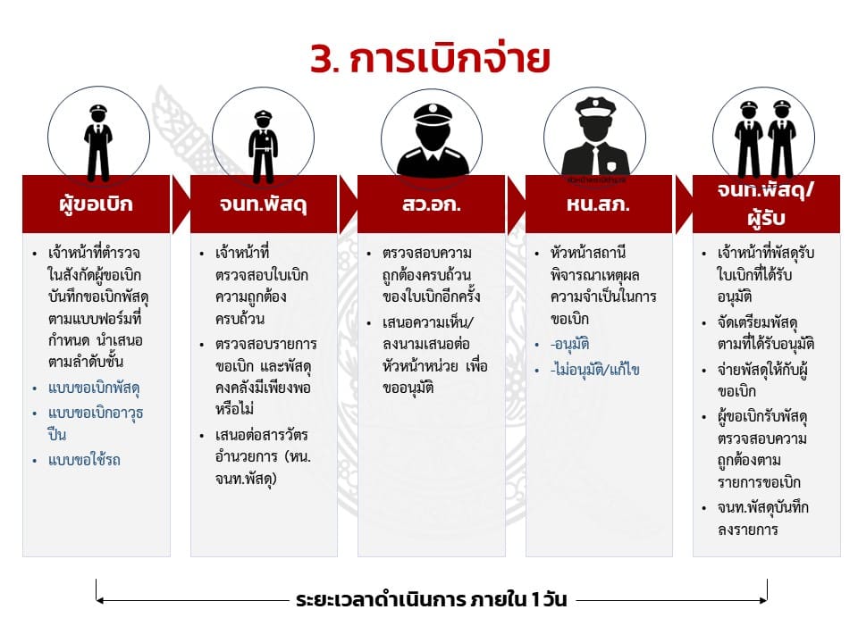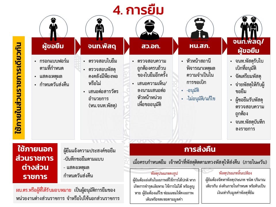 4. กำหนดแนวทางการยืมหรือเบิกจ่ายทรัพย์สินของราชการและของบริจาคไปใช้ปฏิบัติงานที่ชัดเจน